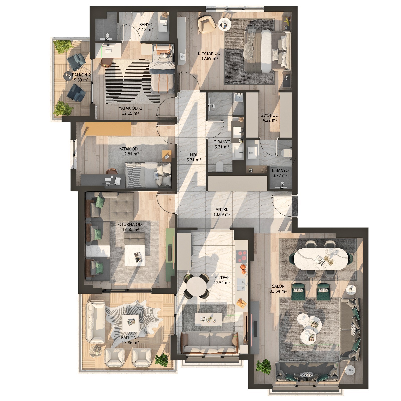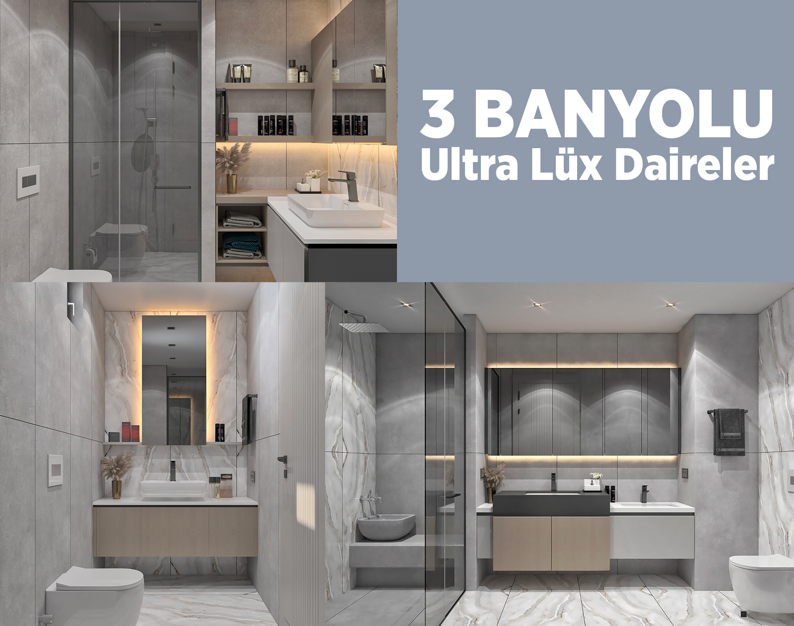 Detaylı planlanmış projemiz 4+1 dire konsepti yanında 3 banyolu oluşuyla da ayrıcalıklıdır.